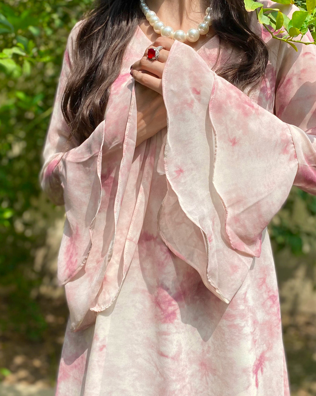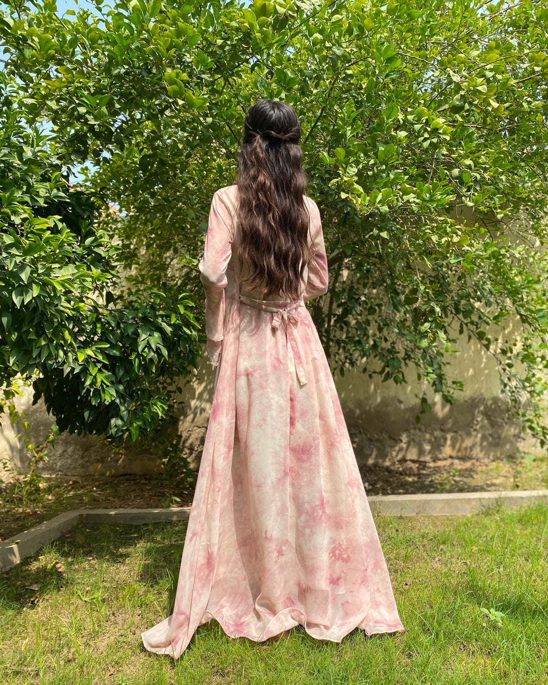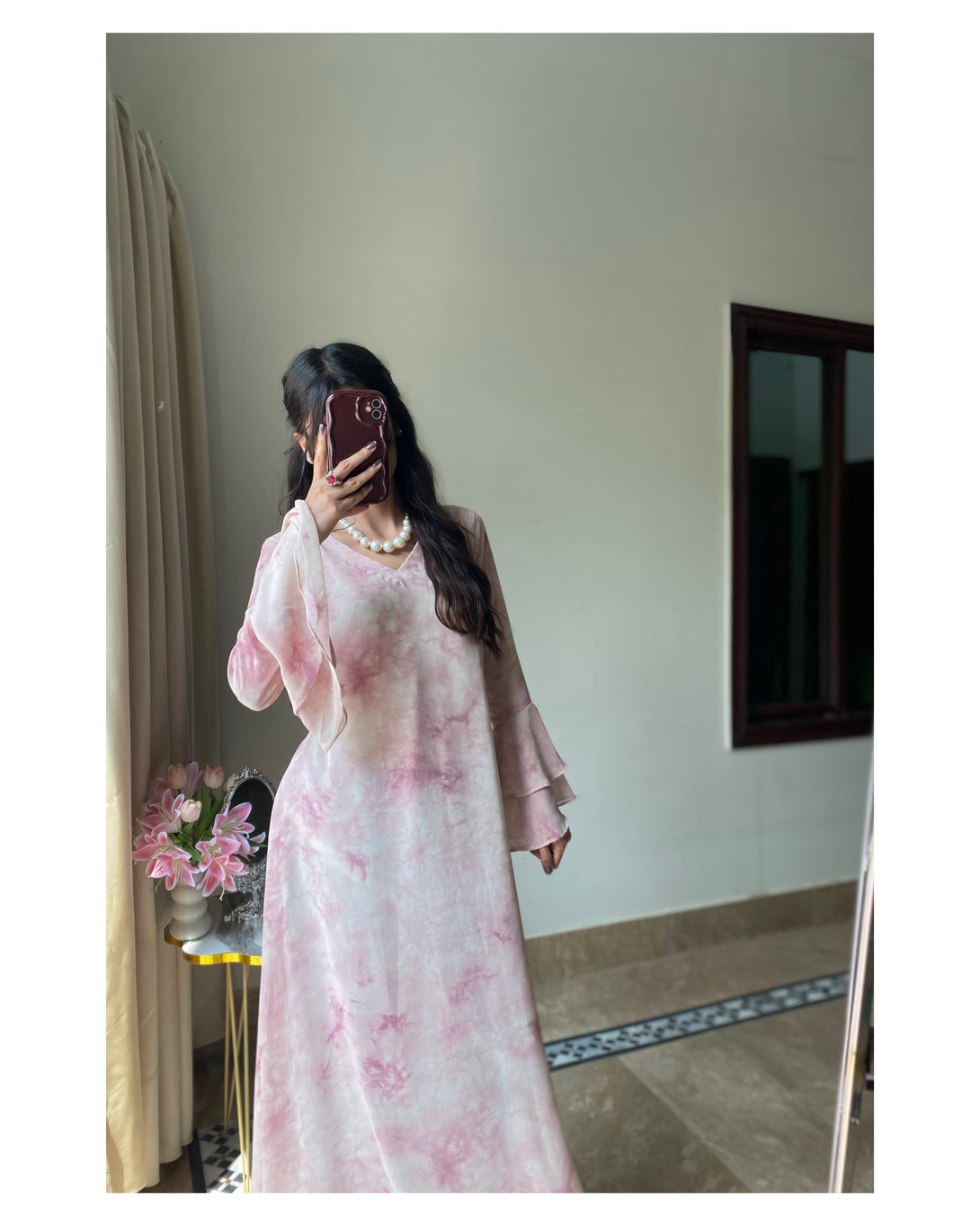 Product Detail: The Sakura Mist Pink Floral Long Dress , A dreamy blend of soft chiffon and delicate floral prints inspired by cherry blossom petals. Featuring layered bell sleeves and a relaxed silhouette, this flowy dress is cinched subtly at the waist with a fabric tie, offering both comfort and feminine charm. The stitched inner provides effortless wearability, while the airy fabric creates a graceful movement with every step. Ideal for garden gatherings, brunches, or sunset strolls, it’s a picture of floral sophistication in full bloom.