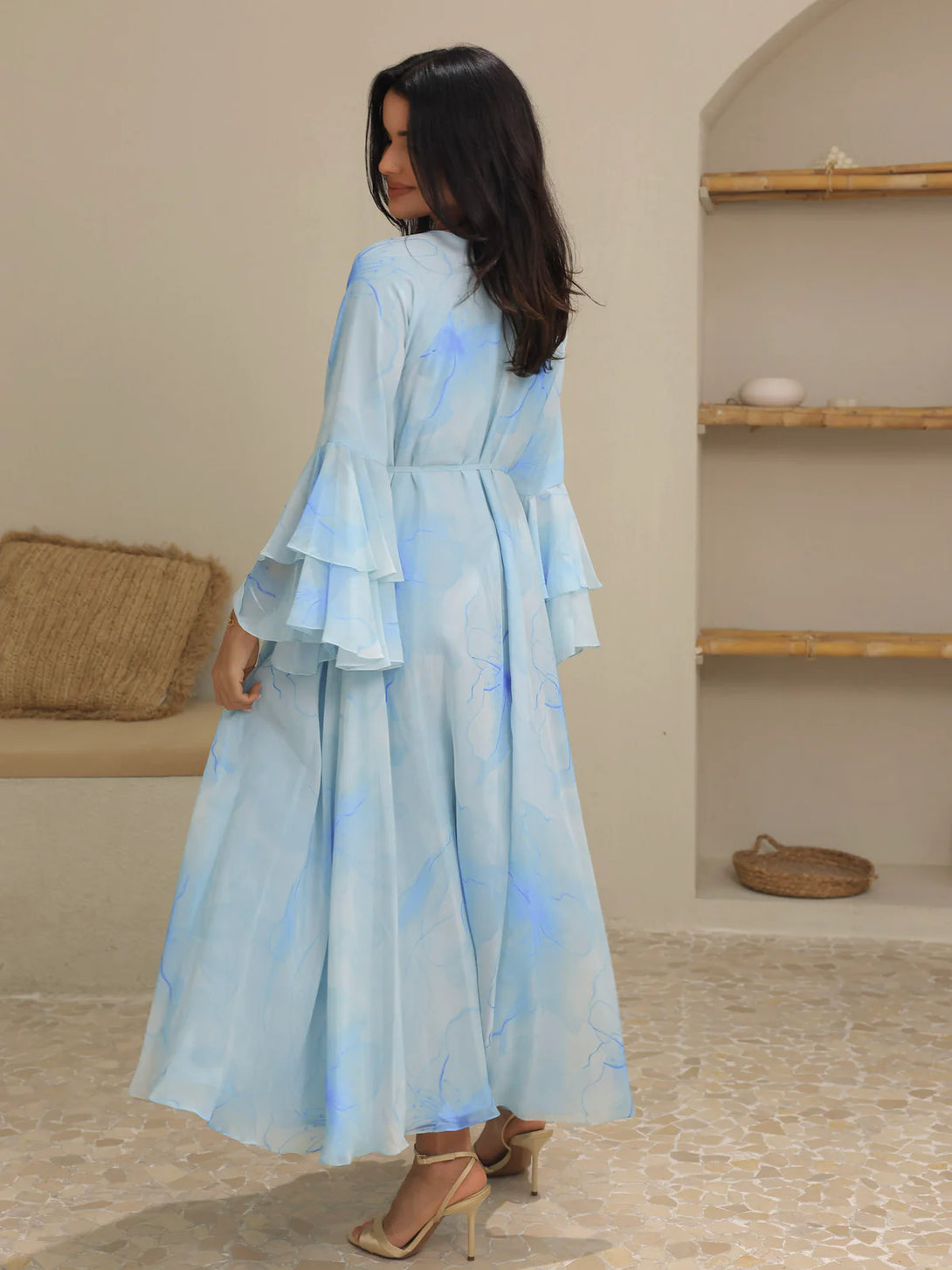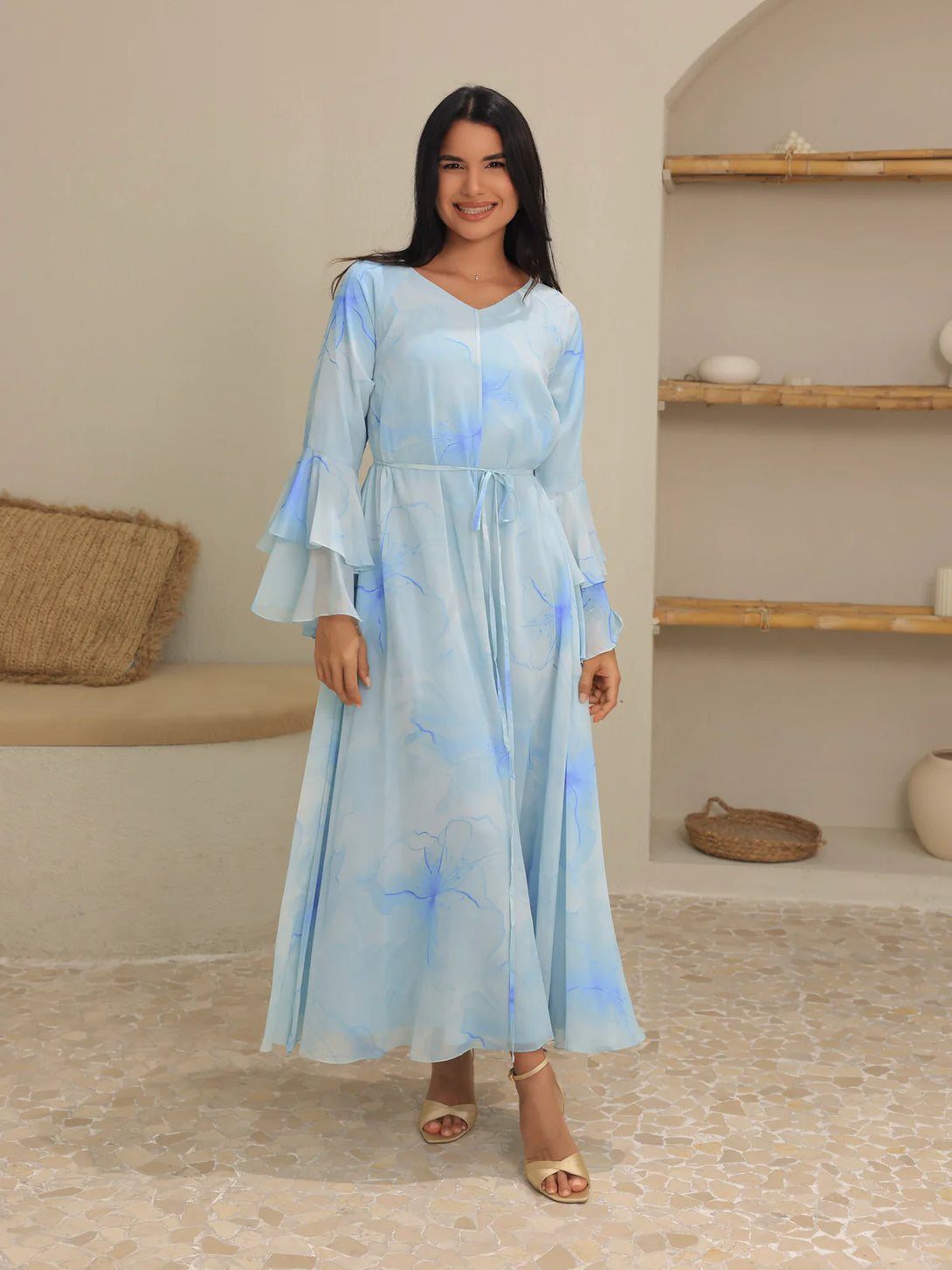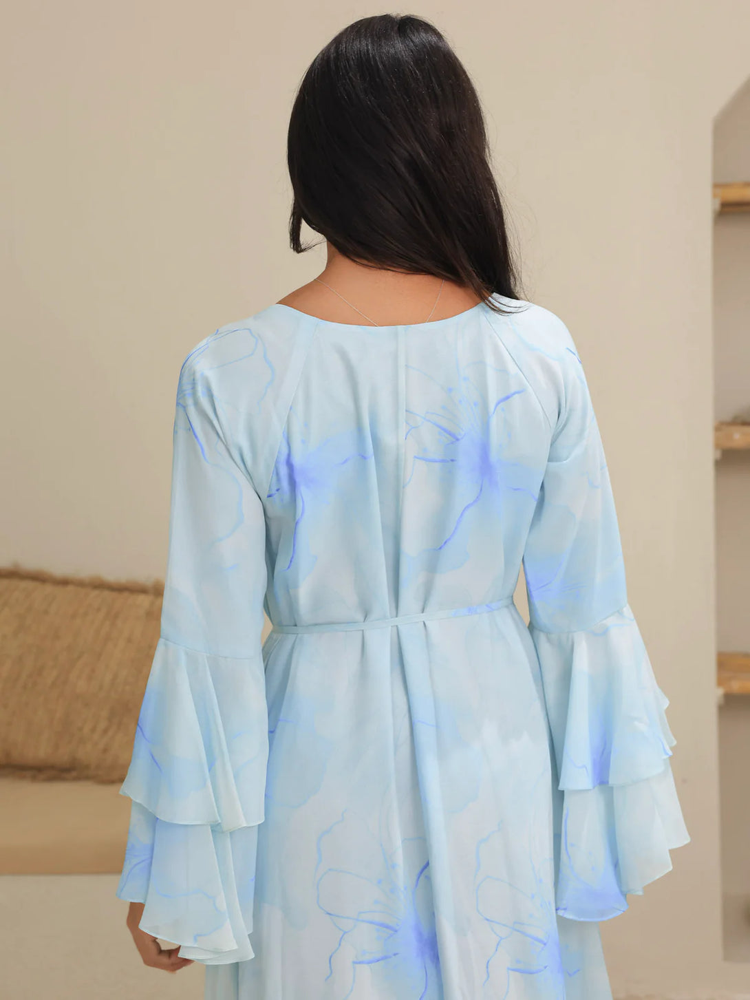 The Sakura Mist Blue Floral Long Dress features delicate chiffon fabric with a soft stitched inner lining for comfort and ease of wear. Its flowing silhouette and floral design make it perfect for elegant occasions or casual outings, combining style with breathable comfort.