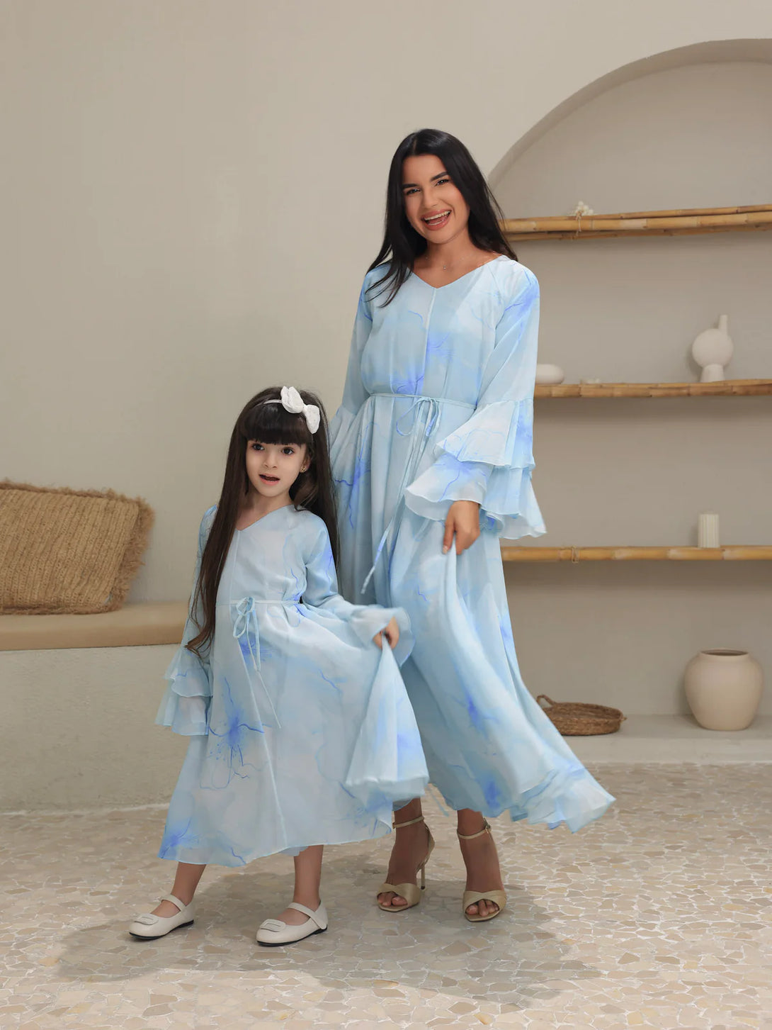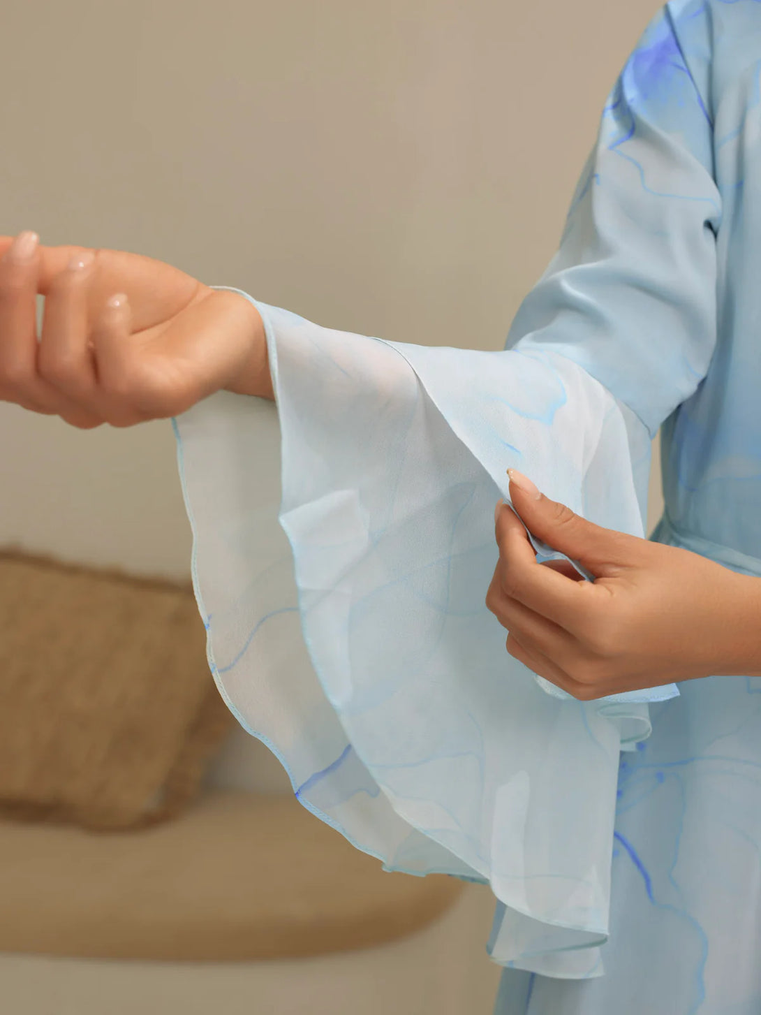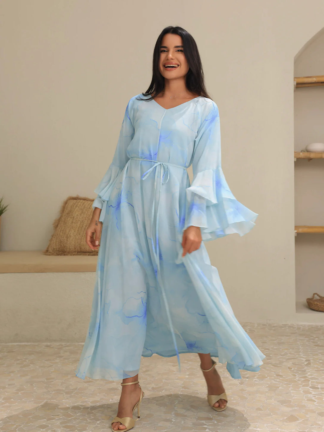 The Sakura Mist Blue Floral Long Dress features delicate chiffon fabric with a soft stitched inner lining for comfort and ease of wear. Its flowing silhouette and floral design make it perfect for elegant occasions or casual outings, combining style with breathable comfort.