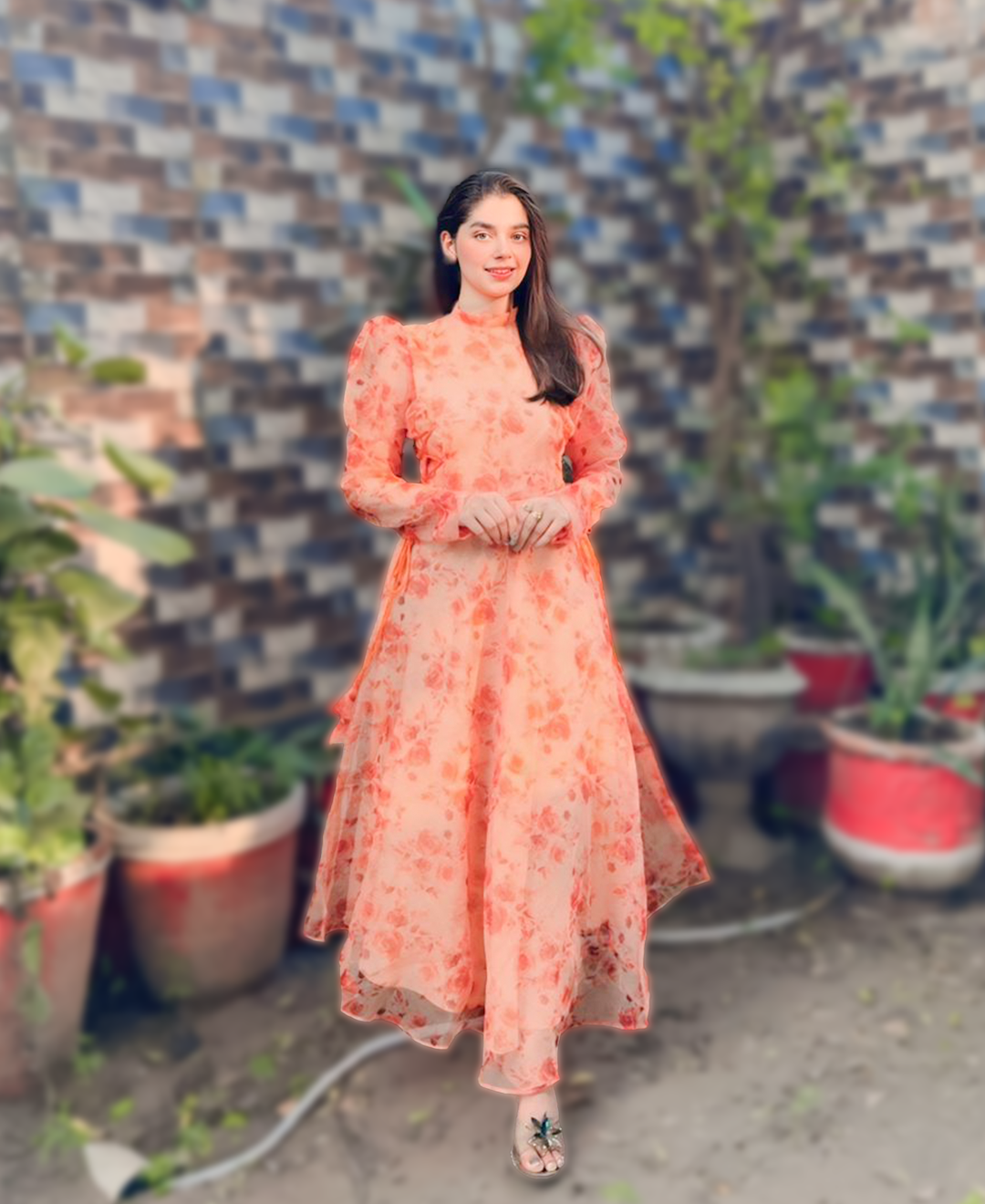 Product Detail: Meet this gorgeous peach floral Maxi dress featuring true victorian vibes with a high neck design, long sleeves and side tie detailing like never before!! Made with Printed Tissue Organza with stitched inner, we're confident you can steal any spotlight with our beautiful design at any event.